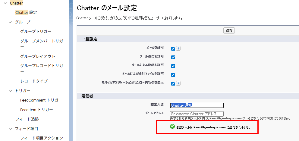 設定変更が反映されたか、Chatter投稿などで通知メールが届くかを確認します