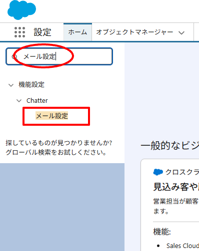 2.クイック検索に 「メール設定」 と入力し、 [メール設定] をクリックします