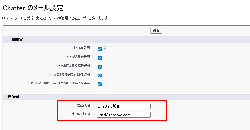 3.「差出人名」 に任意の値、「メールアドレス」 に任意のメールアドレスを入力し、保存します